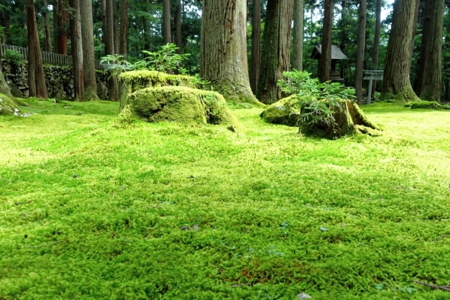 境内一面に広がる苔は、雨に濡れるとさらに鮮やかに輝きます。